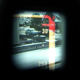 Im rechten Bild sieht man noch einmal einen Blick durch den Sucher, diesesmal etwas vollständiger (als "Motiv" diente mir die einzige freie Fläche meiner Werkbank ;) ). Links am Bildbegrenzungsrahmen sind die Markierung für die Entfernungseinstellung zu sehen: man erkennt die Symbole (von unten nach oben) für Brustbild, Personengruppe und Landschaft. Das Symbol für die Portraitaufnahme schließt sich unten an und ist hier nicht mehr im Bild. Mehr brauchte es damals nicht, um zu guten Fotos zu kommen.